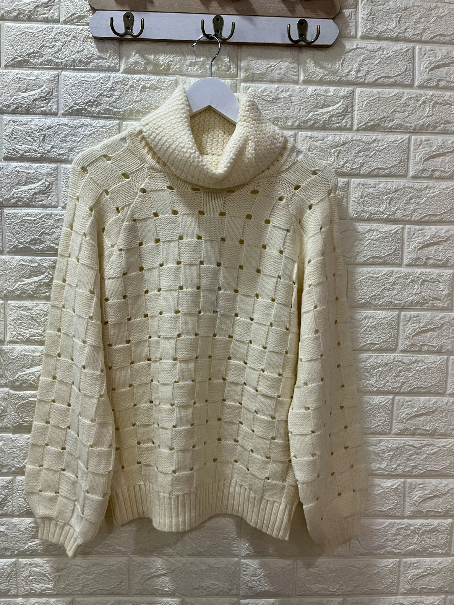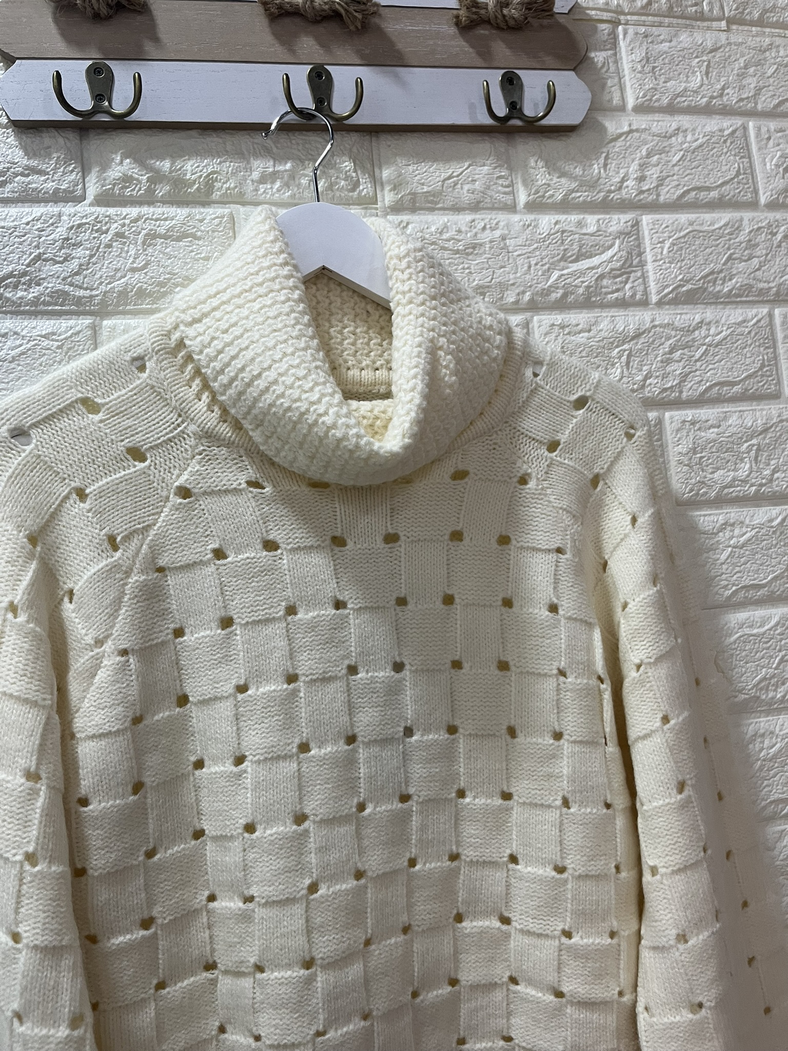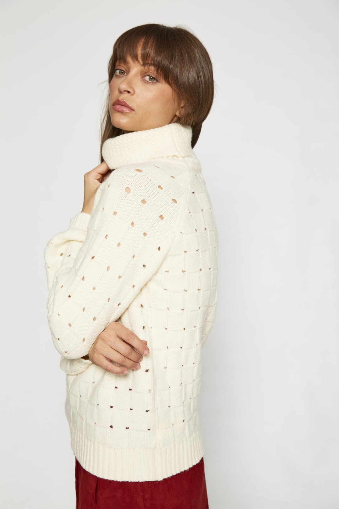 Jersey de punto estructurado con patrón de cuadros calados, cuello cisne acanalado, mangas largas, puños y bajo acanalados. Corte regular-relajado. Color crudo