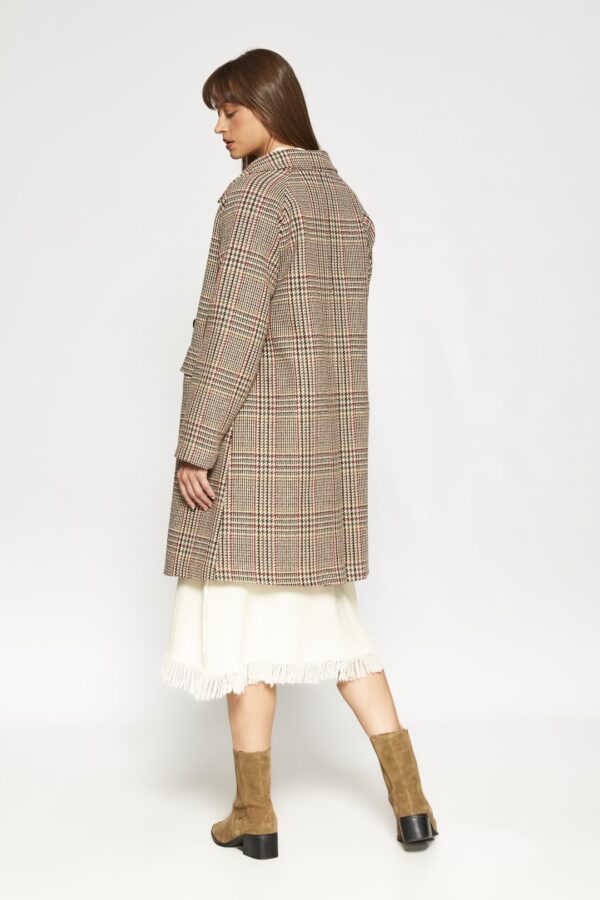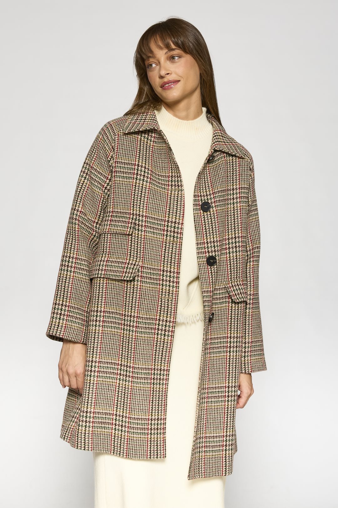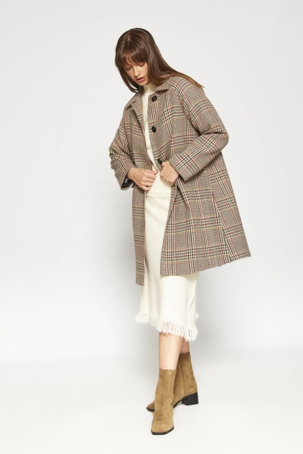 Abrigo clásico y elegante confeccionado en un tejido de cuadros en tonos neutros. Incluye cuello tipo camisa, cierre frontal con botones grandes y discretos, y dos bolsillos amplios en la parte delantera. Su diseño de líneas rectas y longitud hasta encima de la rodilla ofrece comodidad y estilo, perfecto para combinar con jerséis o blusas en conjuntos formales o de día.