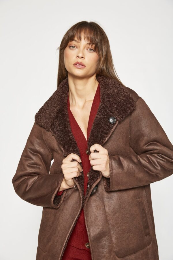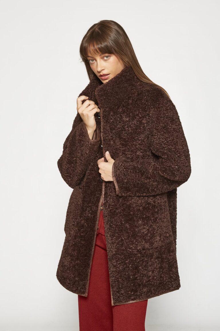 Abrigo reversible con un lado de borrego mullido y otro de efecto ante liso, cierre frontal completo y corte recto o ligeramente oversize para máxima versatilidad y estilo. Color marrón