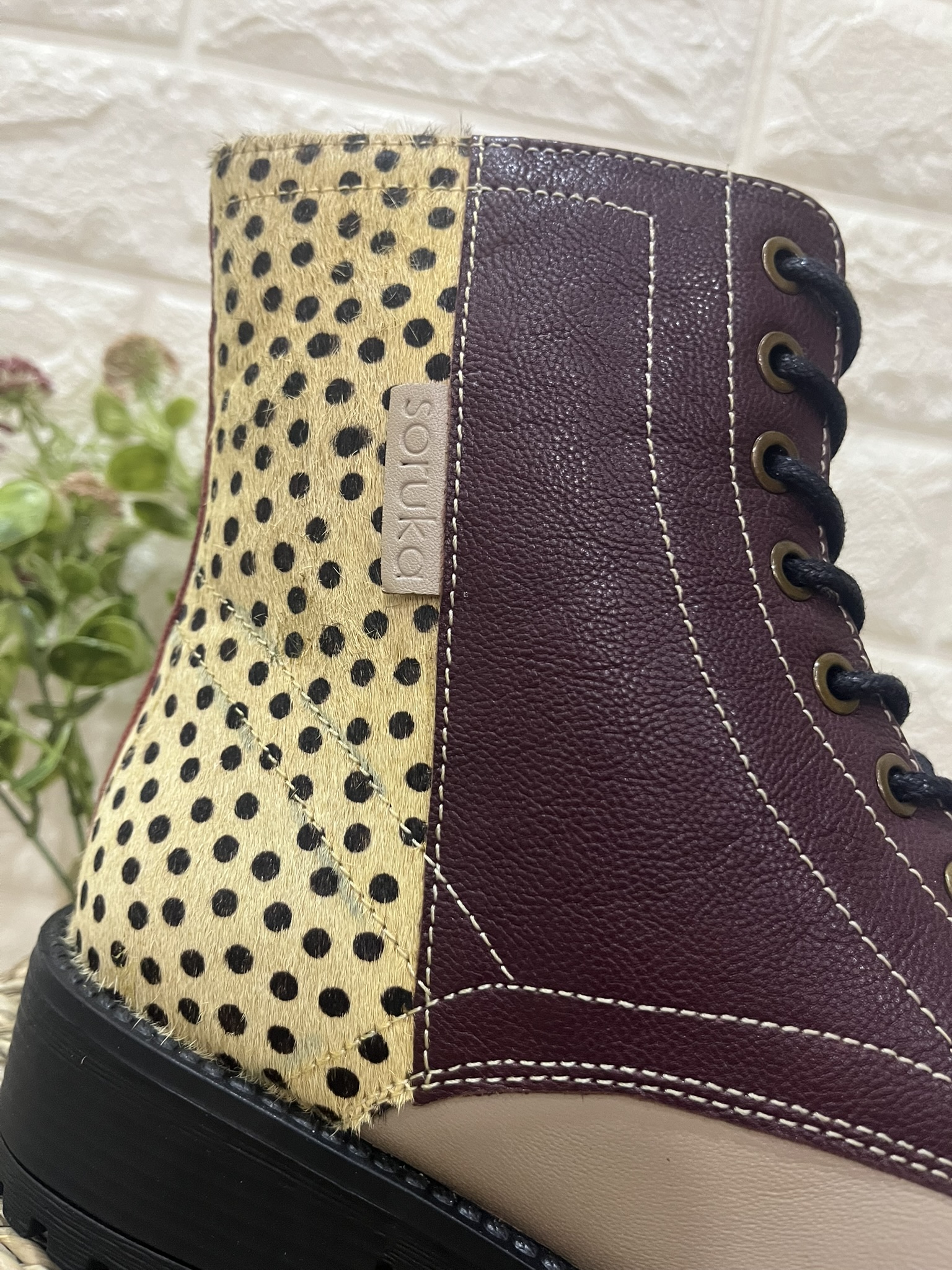 Botín de piel SORUKA, con un diseño original que combina zonas lisas en tonos berenjena y beige claro con un toque de animal print.