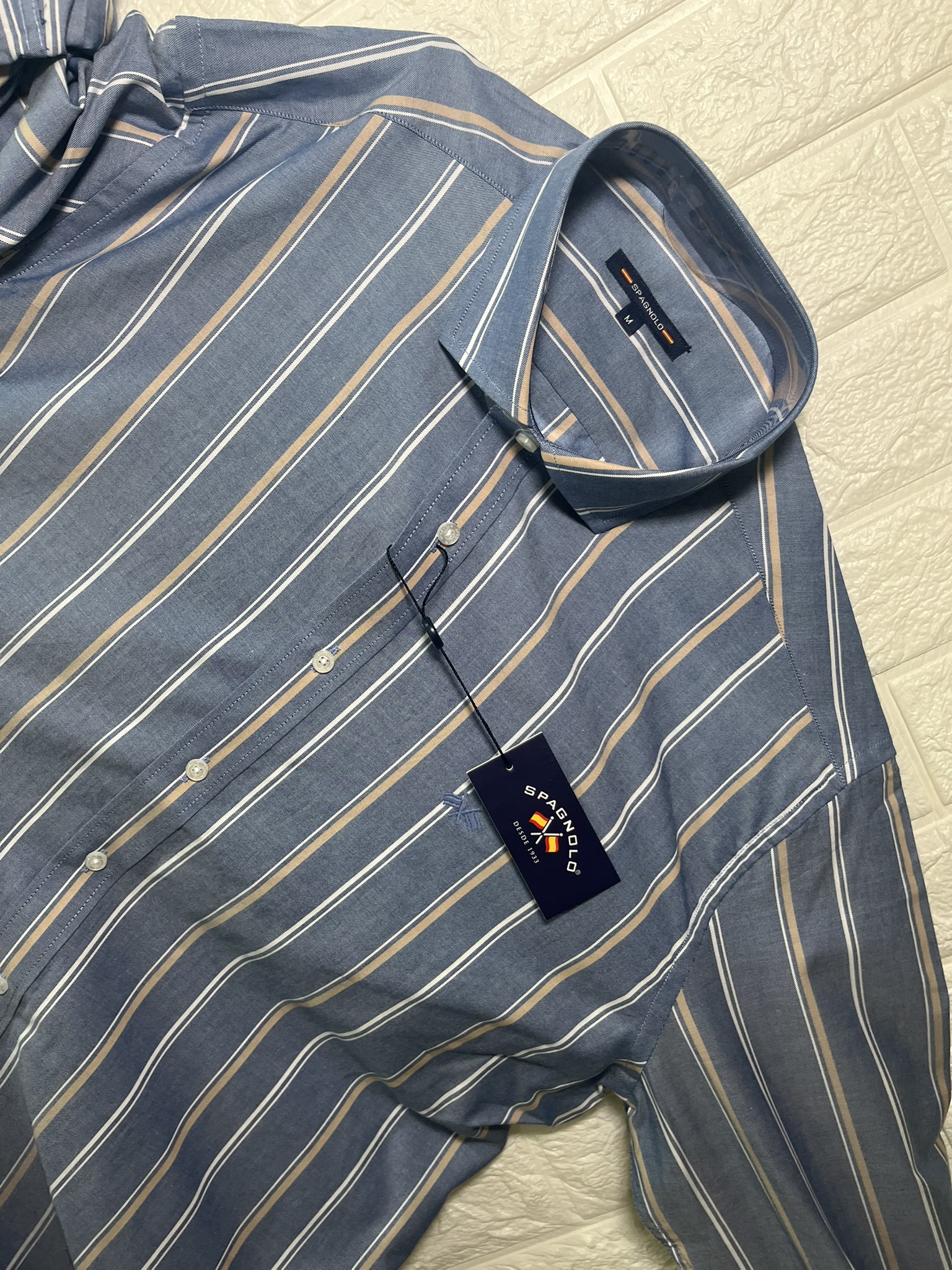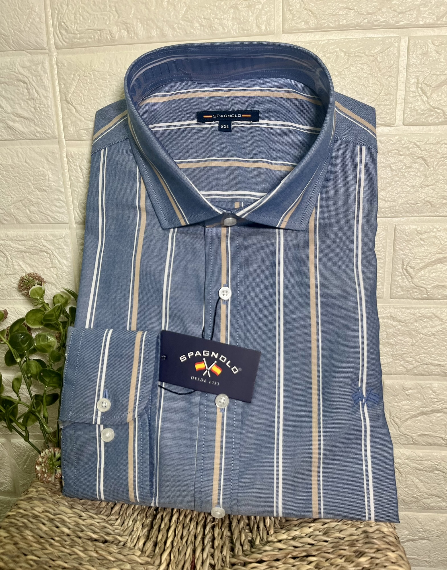 Camisa de hombre Spagnolo, logo bordado al tono, de color azul con rayas verticales en tonos beige y blanco. Diseño elegante y clásico, ideal para un estilo casual o semi formal