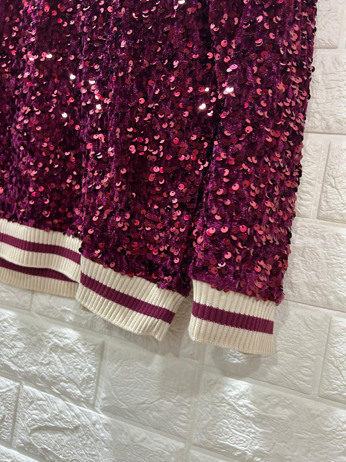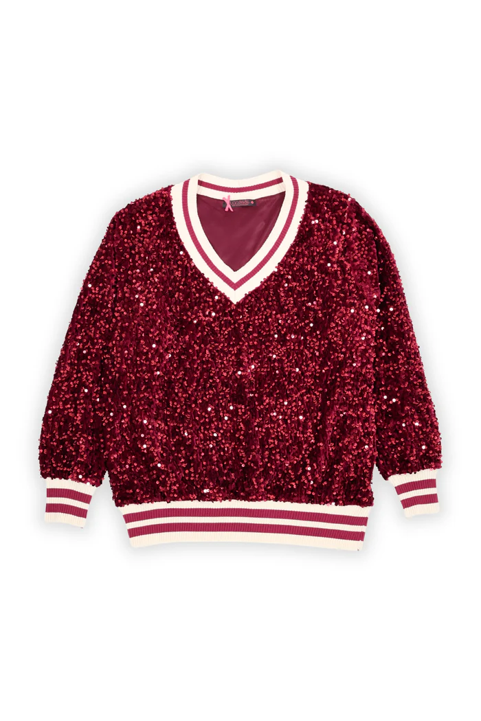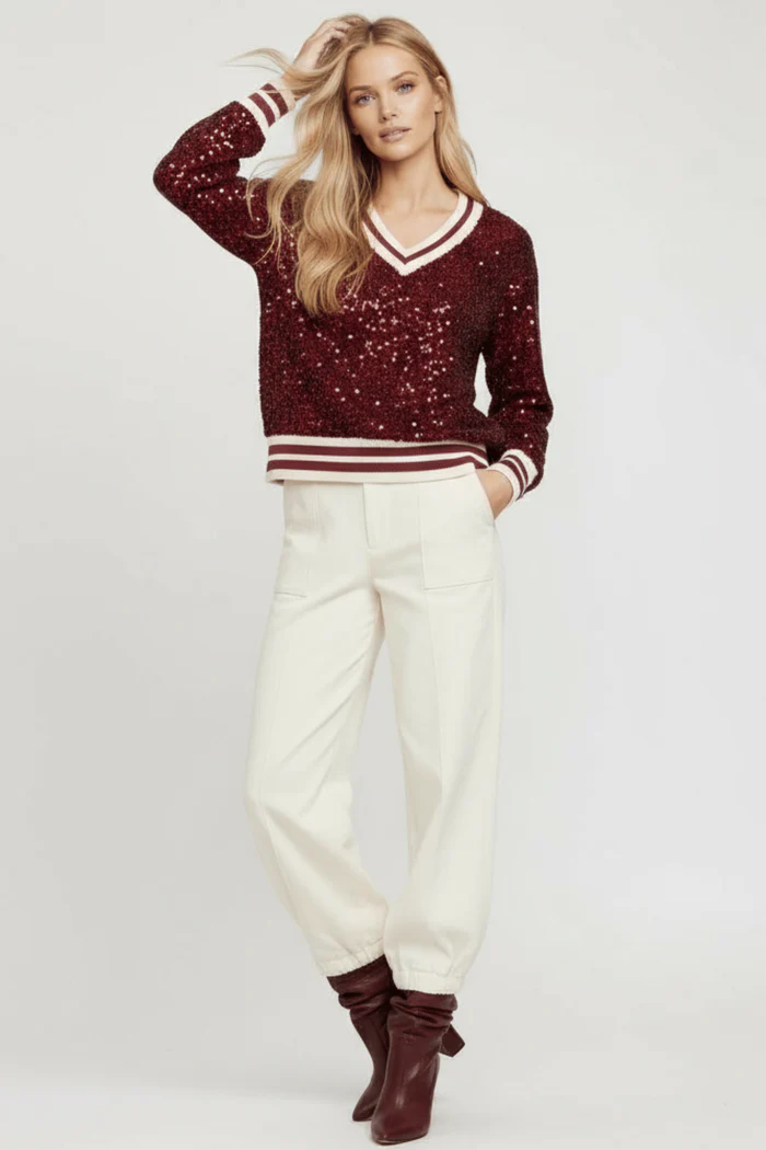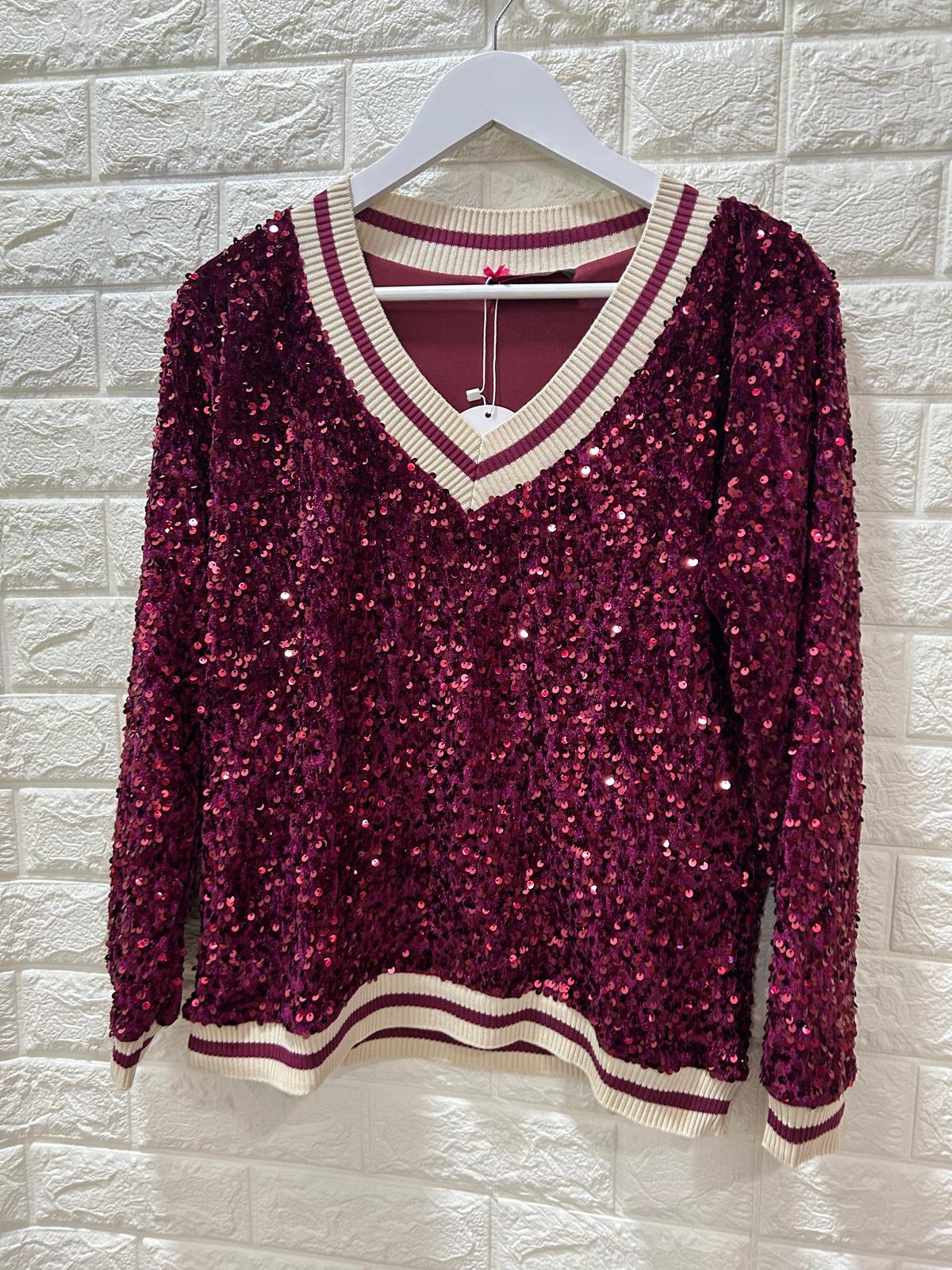 Sudadera de lentejuelas burdeos con cuello en V y ribetes a rayas en blanco y burdeos. De estilo moderno y llamativo, combina el brillo de las lentejuelas con el confort de un diseño casual. Ideal para looks festivos o para darle un toque especial a un outfit diario.