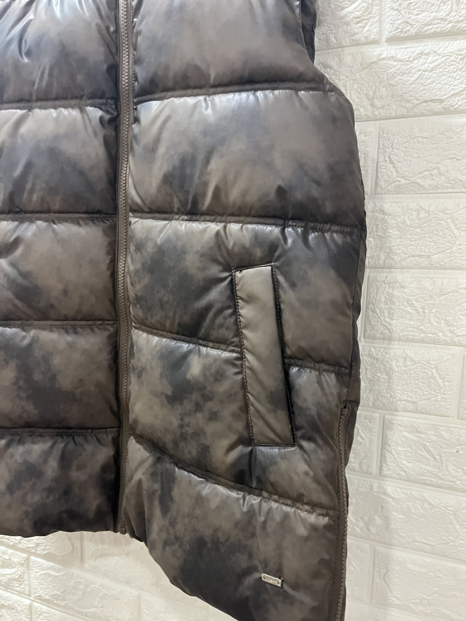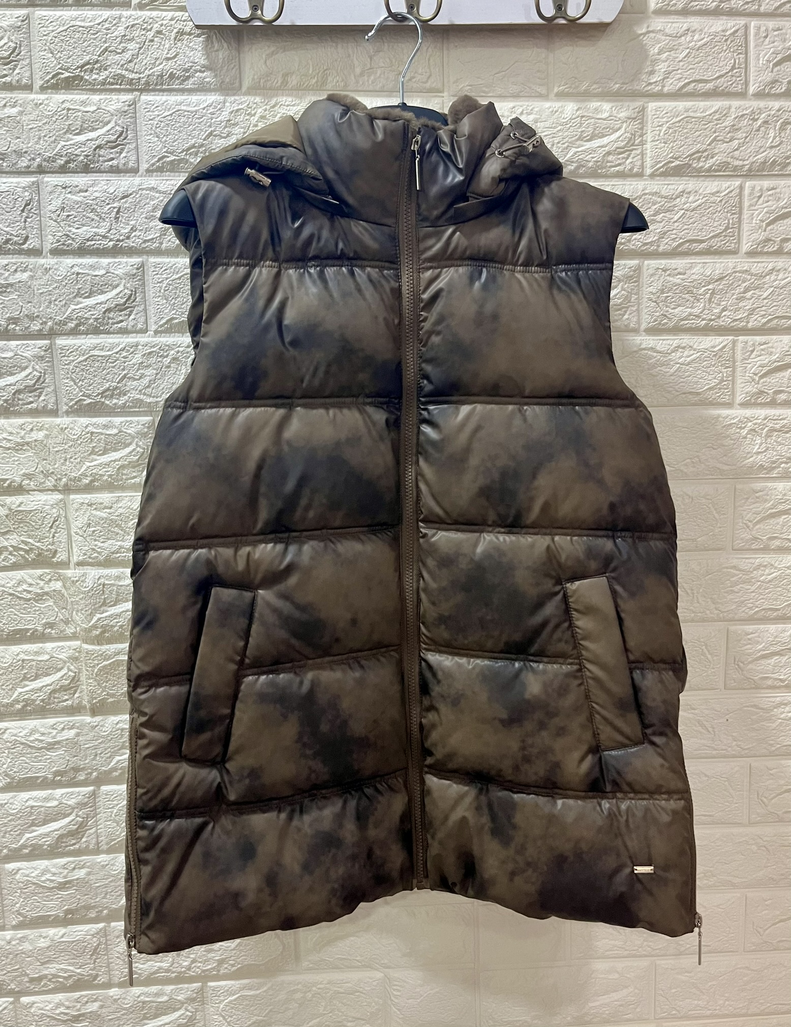 Chaleco acolchado con capucha (opcional). En tonos marrón oscuro con efecto camuflaje difuminado, ideal para un look casual y abrigado en días fríos.