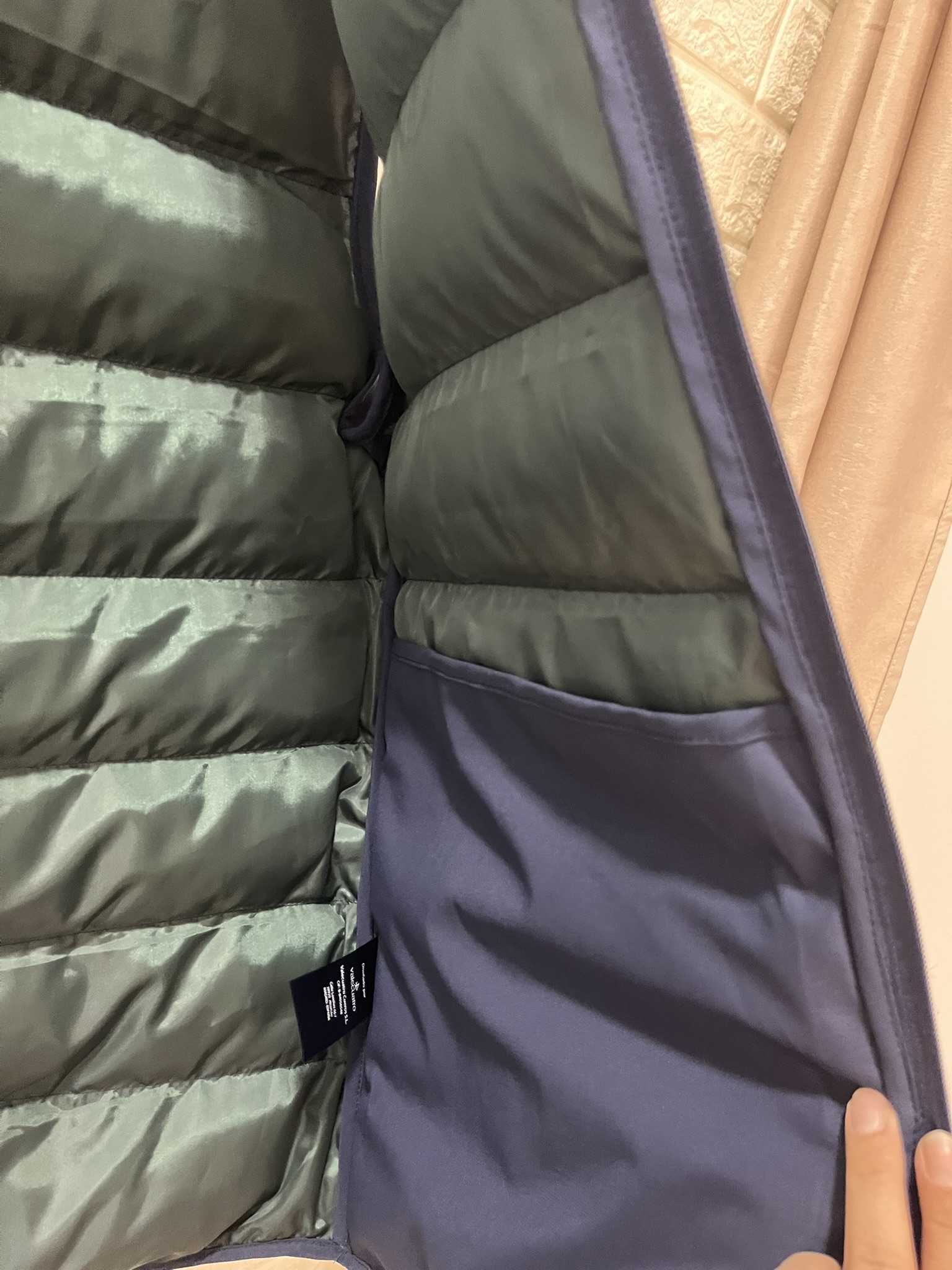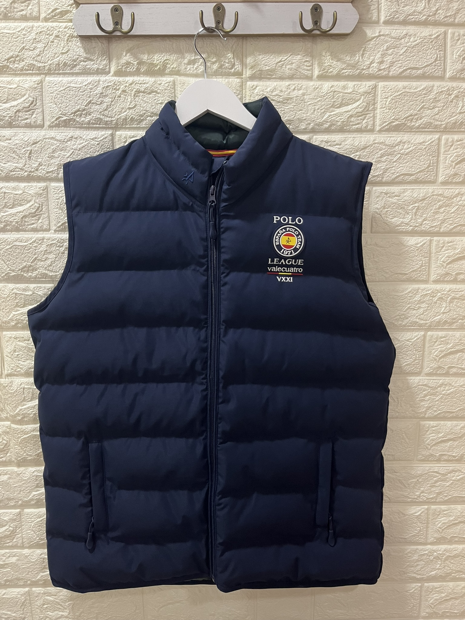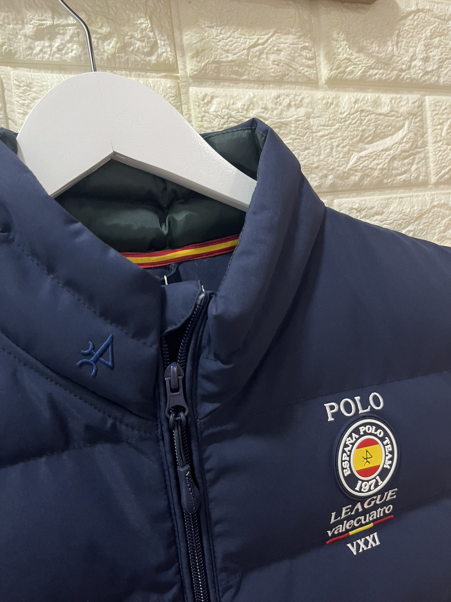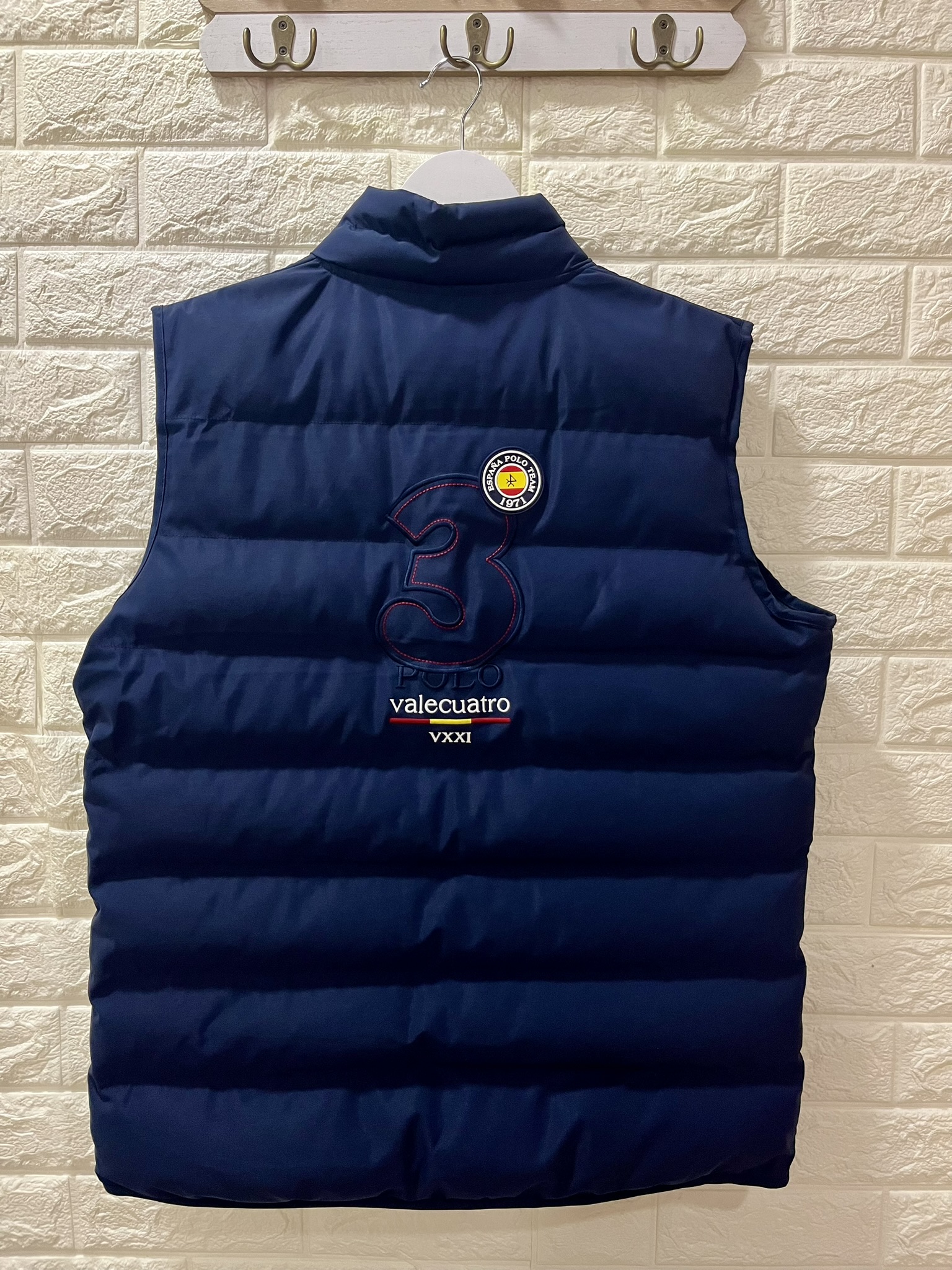 Chaleco acolchado azul marino de corte casual, con cuello alto. Dos bolsillos laterales con cremallera. Bordado en el pecho e interior en contraste.