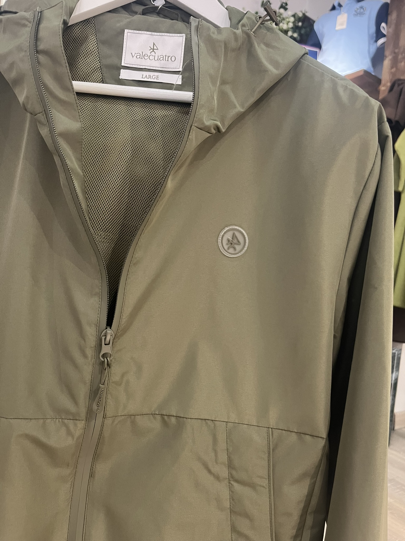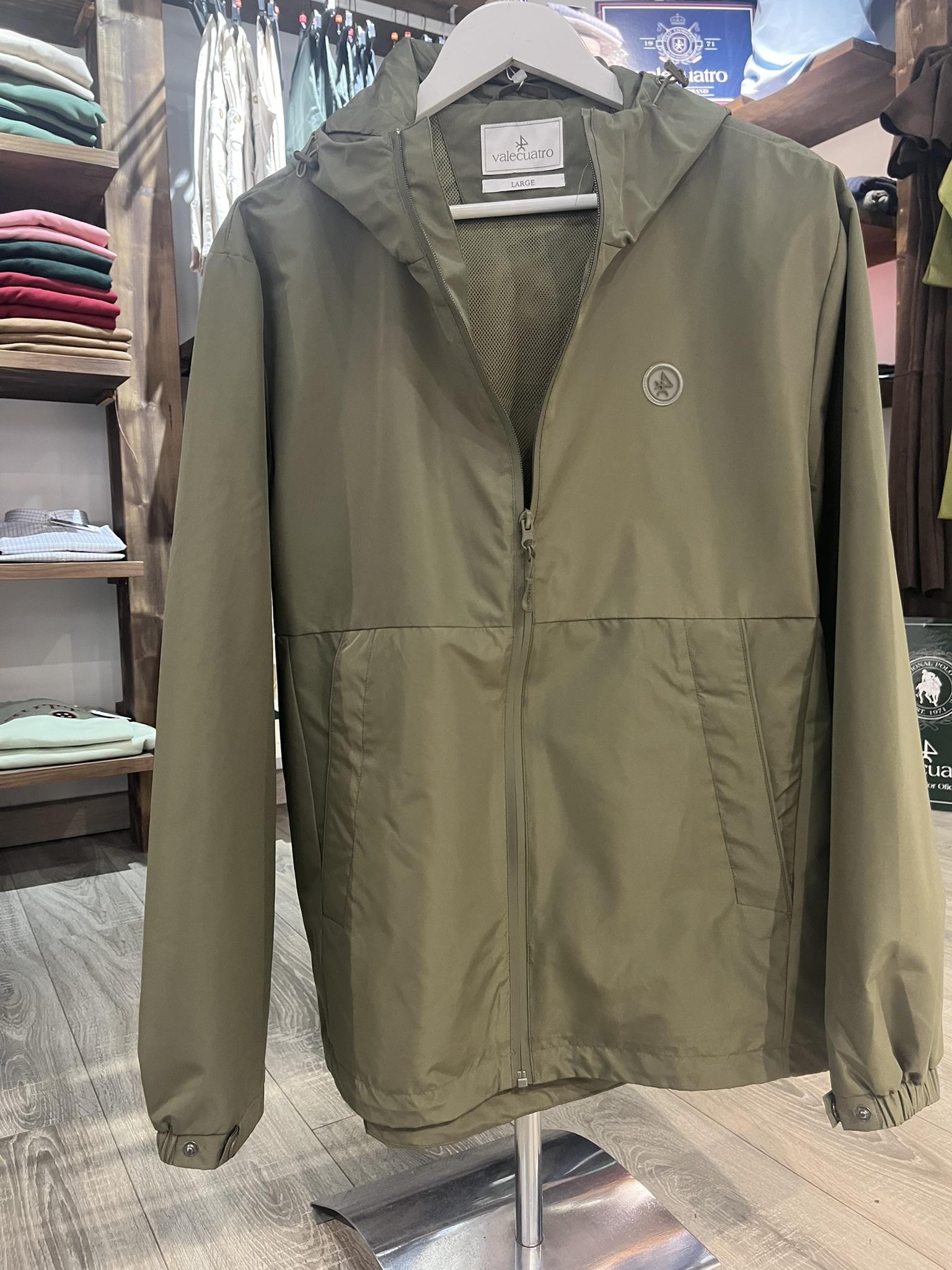 Chaqueta cortavientos kaki con capucha fija, puños ajustables y tres bolsillos. Ligera y funcional.