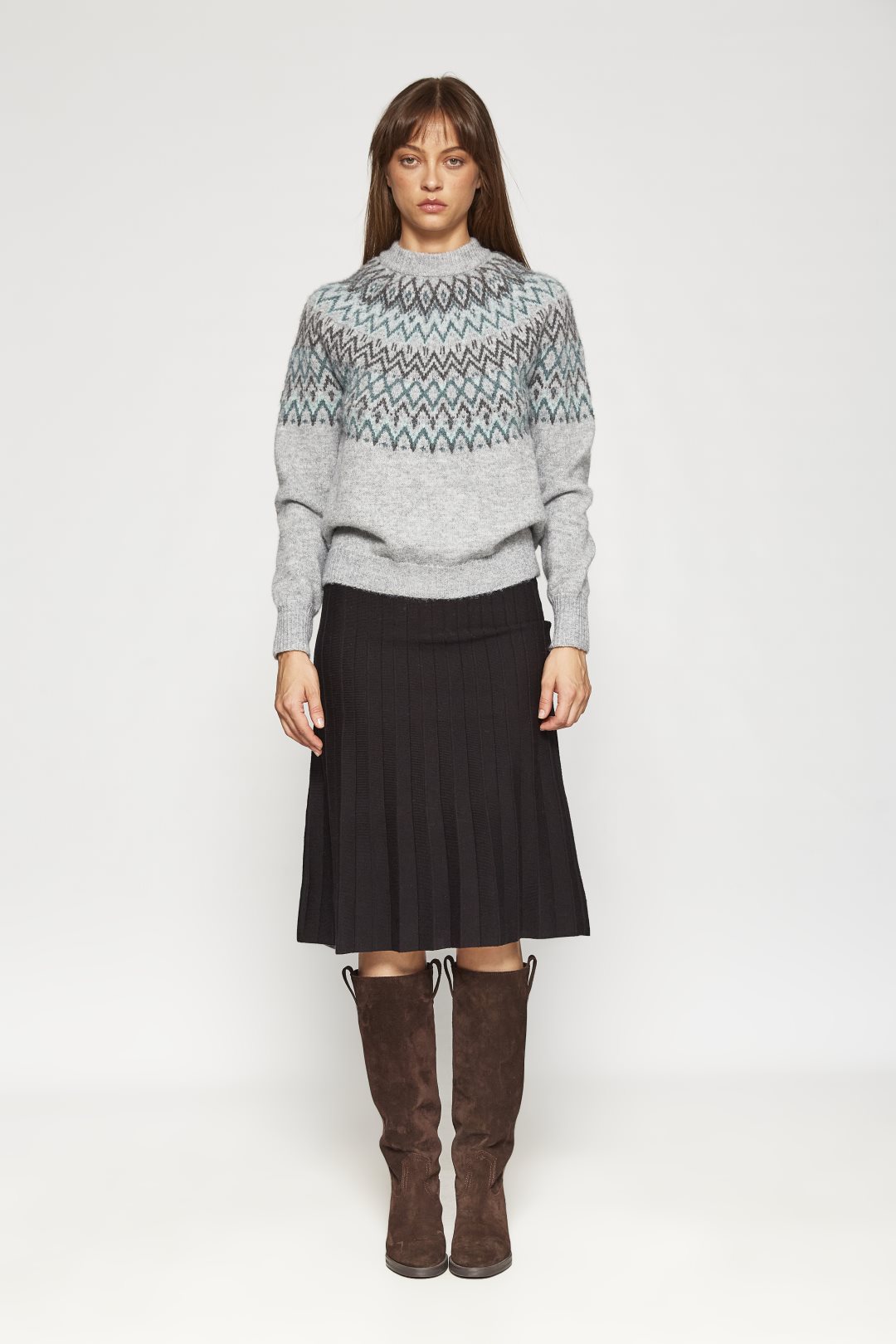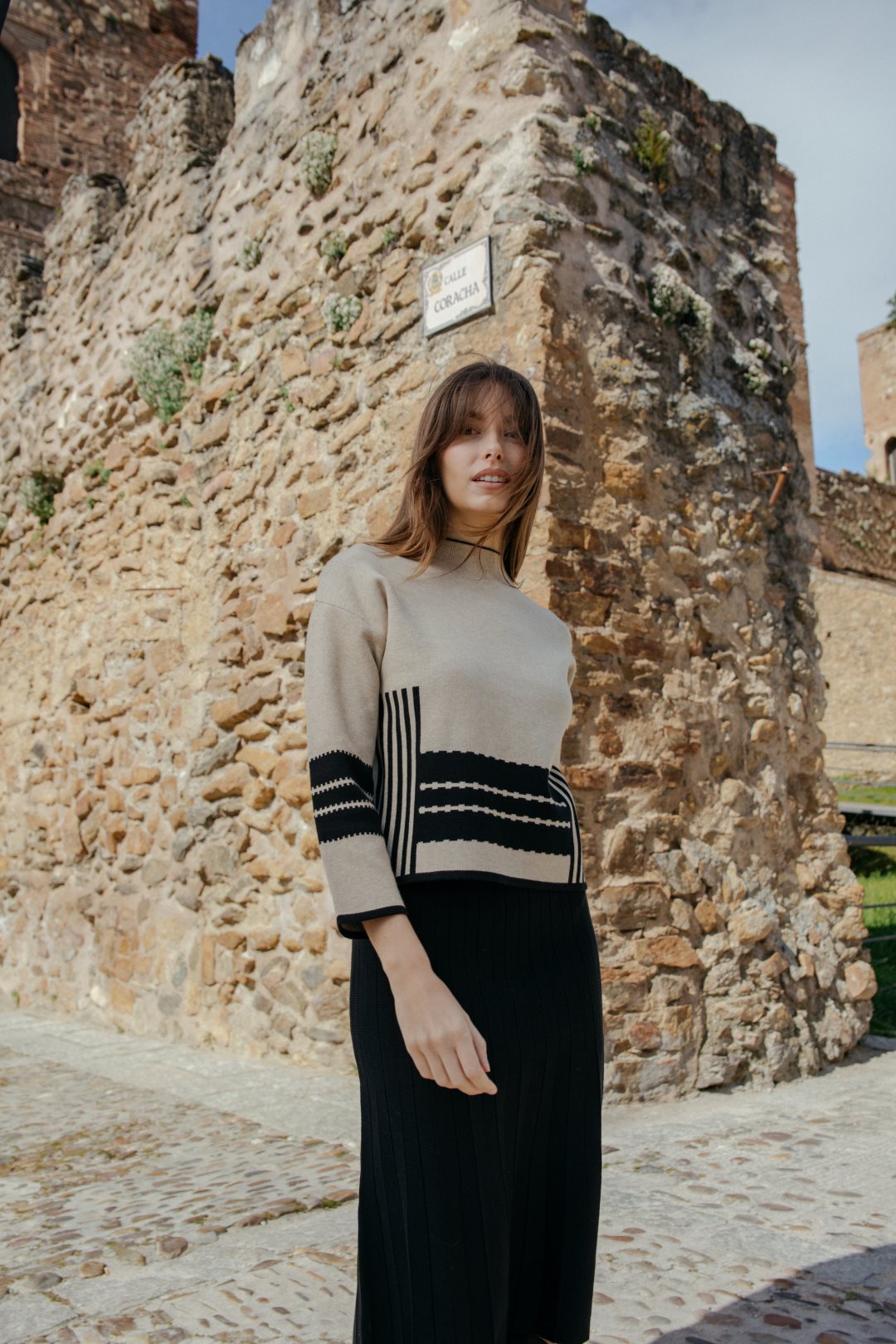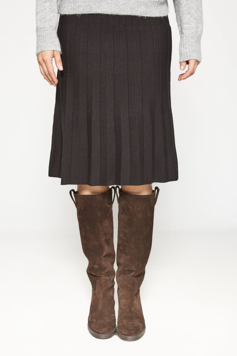 Falda de punto de largo medio confeccionada en un tejido fino con canalé vertical que aporta estructura y elasticidad. Incorpora una cintura elástica ancha para un ajuste cómodo y adaptable. Su silueta recta, ligeramente evasé en el bajo, ofrece libertad de movimiento y una caída favorecedora. La prenda llega hasta la rodilla o un poco más abajo y presenta un acabado limpio sin costuras visibles.