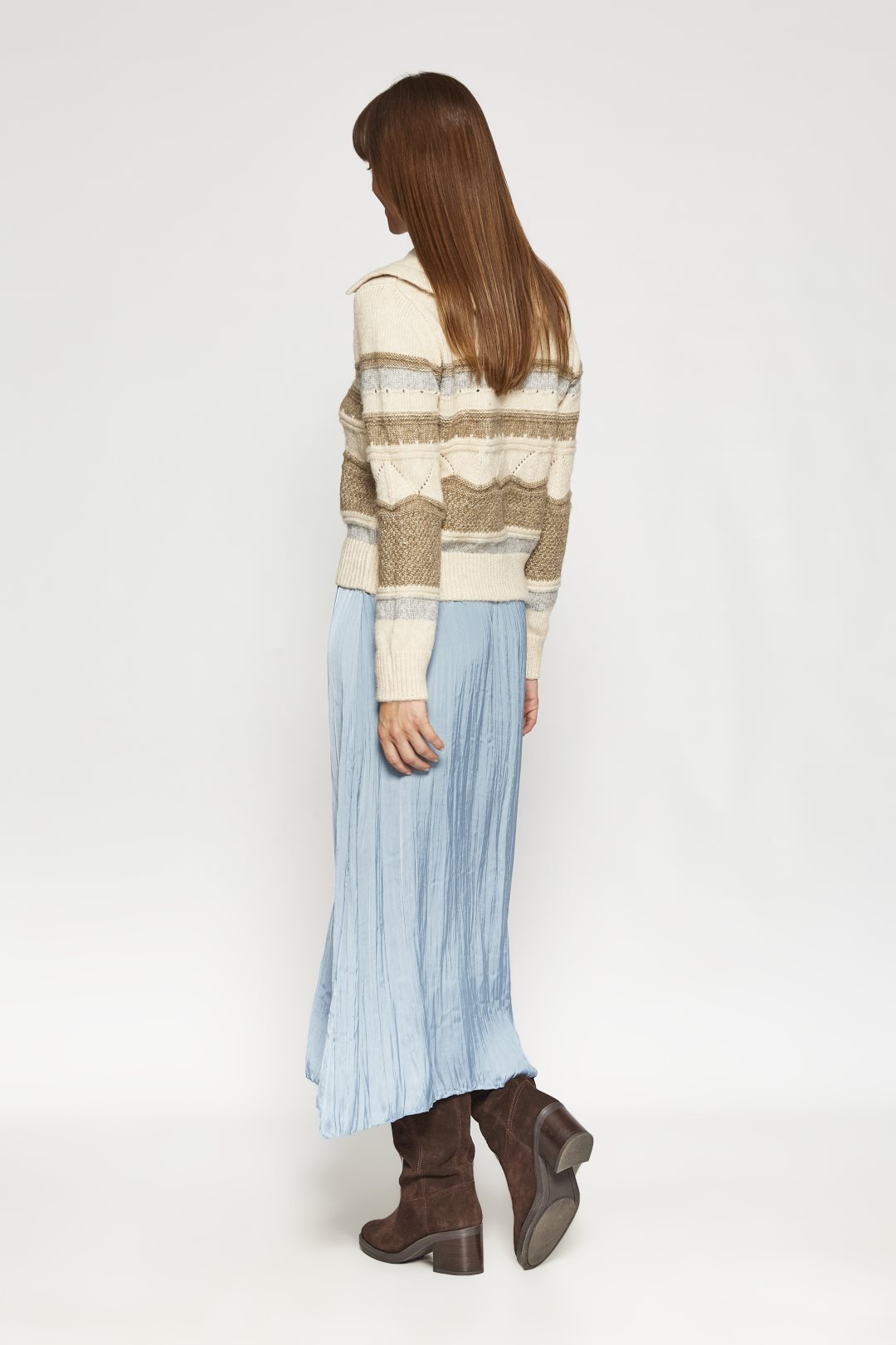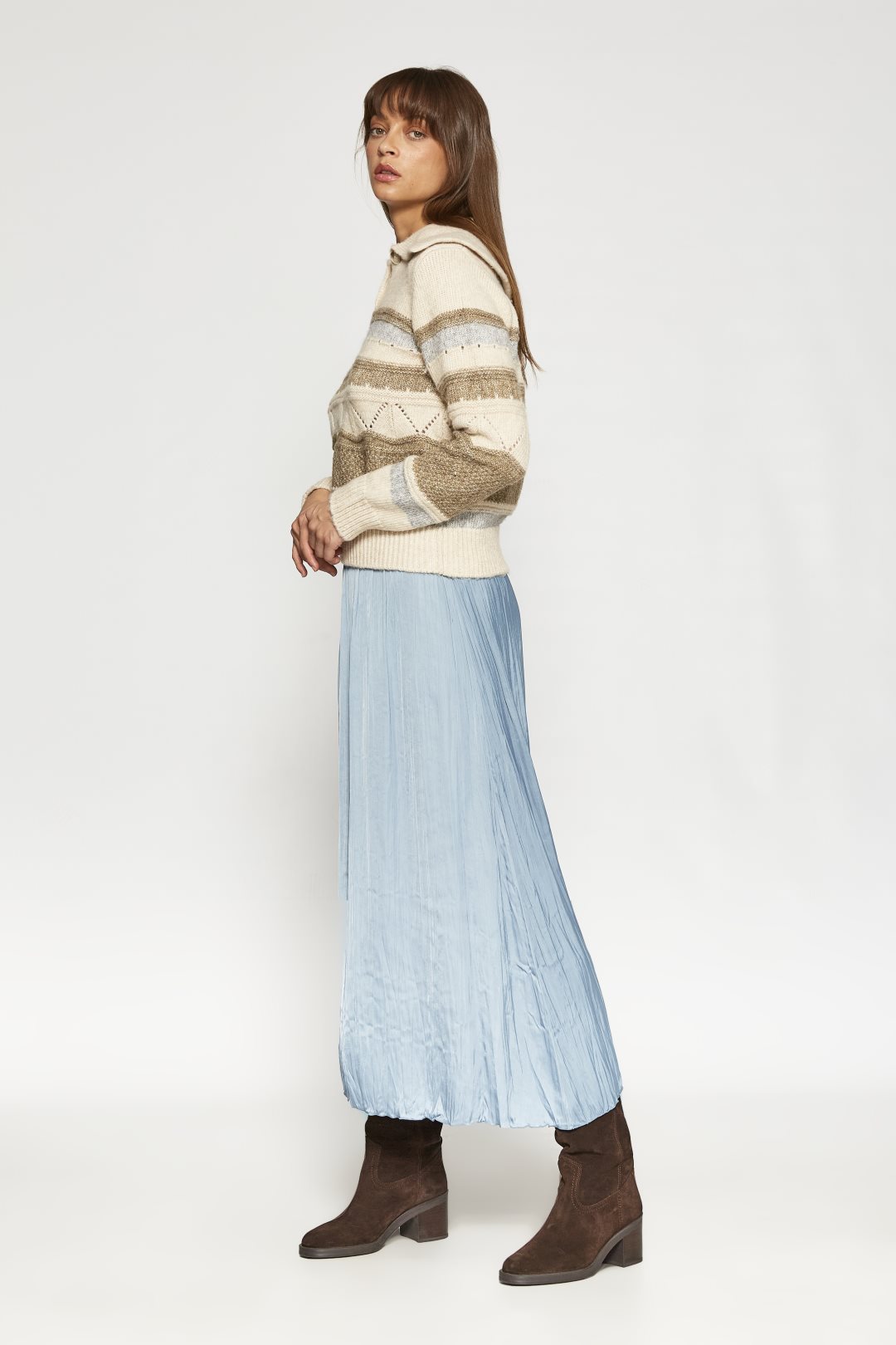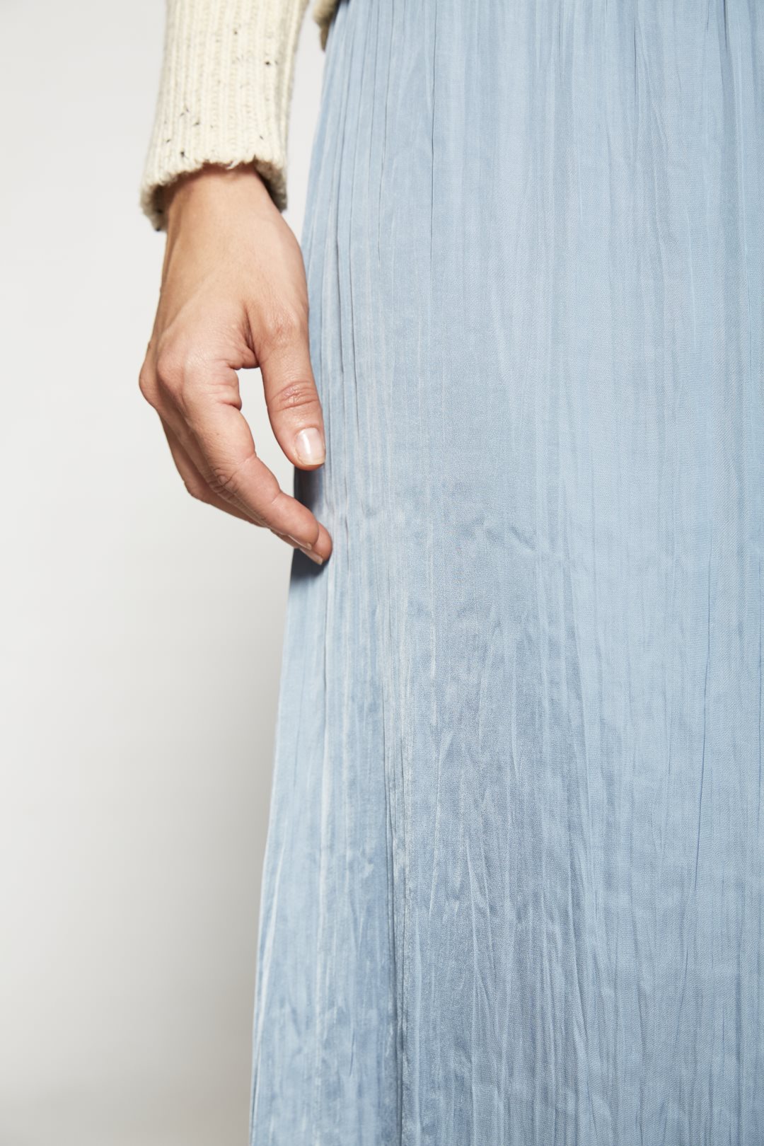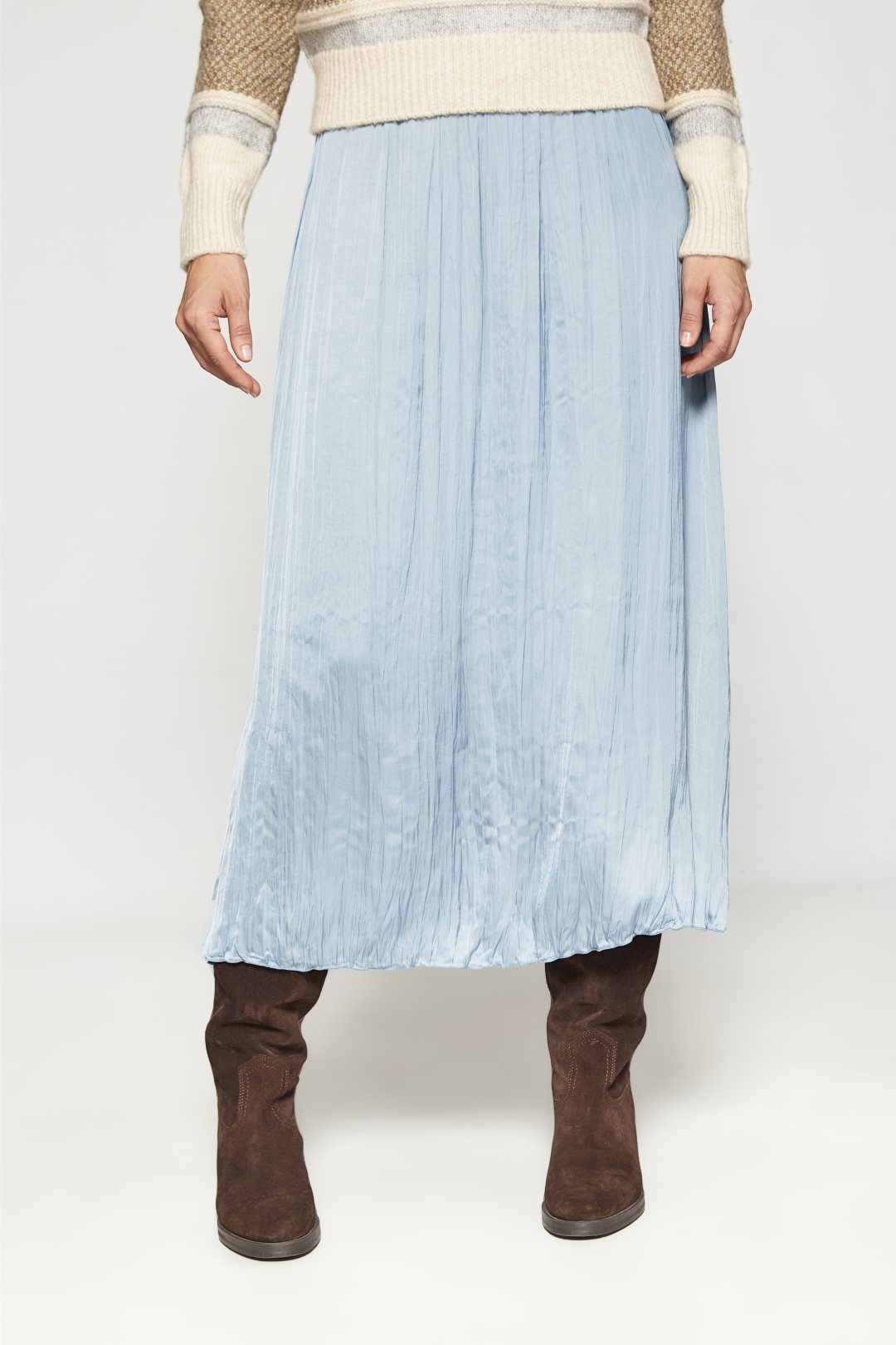 Falda midi confeccionada en un tejido fluido y ligero con sutil textura arrugada que aporta una caída natural y elegante. Su cintura elástica ofrece un ajuste cómodo, mientras el fruncido superior añade volumen y realza la silueta. De corte amplio y movimiento libre, es una prenda versátil y chic, perfecta para combinar con blusas, jerseys o tops en looks contemporáneos.