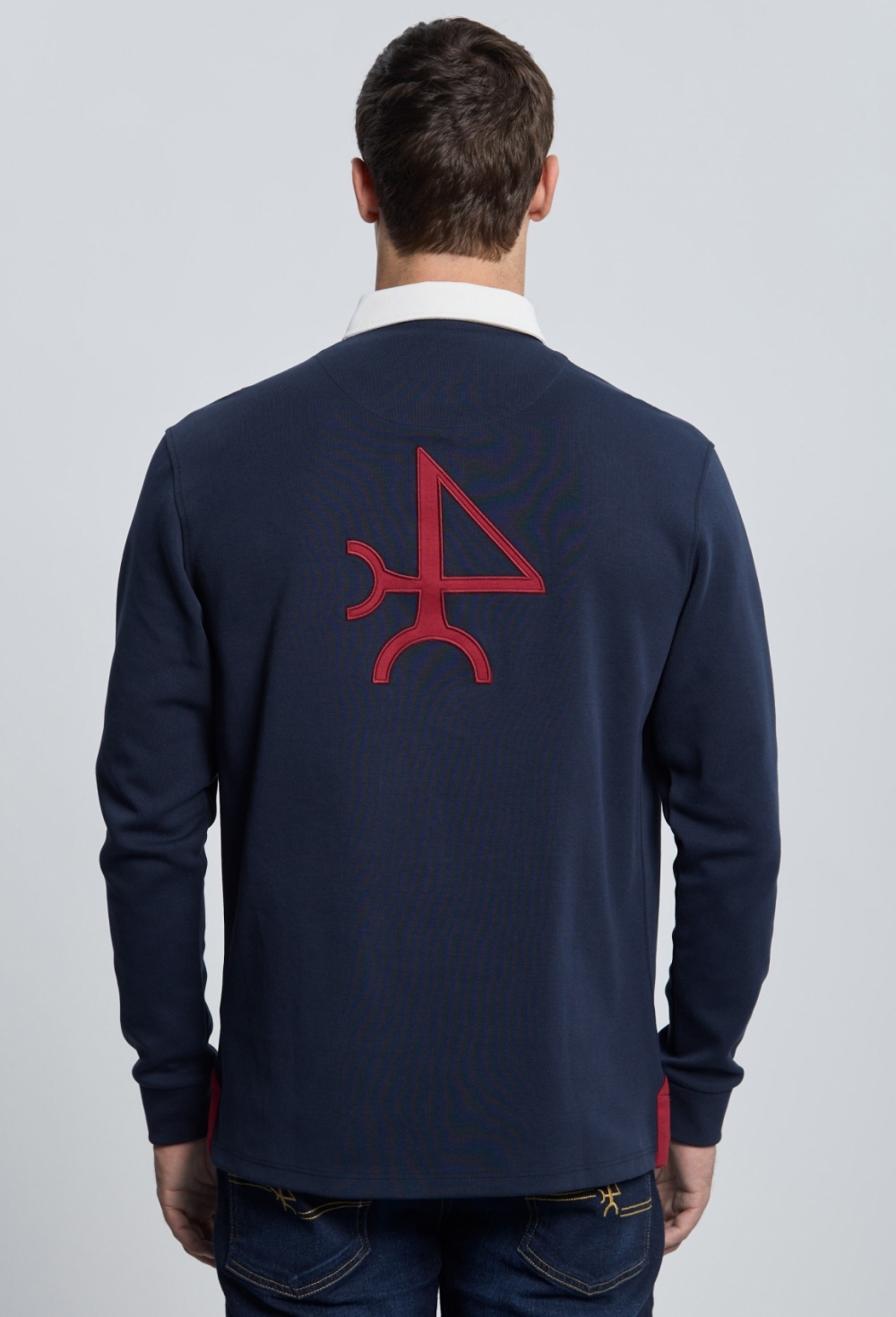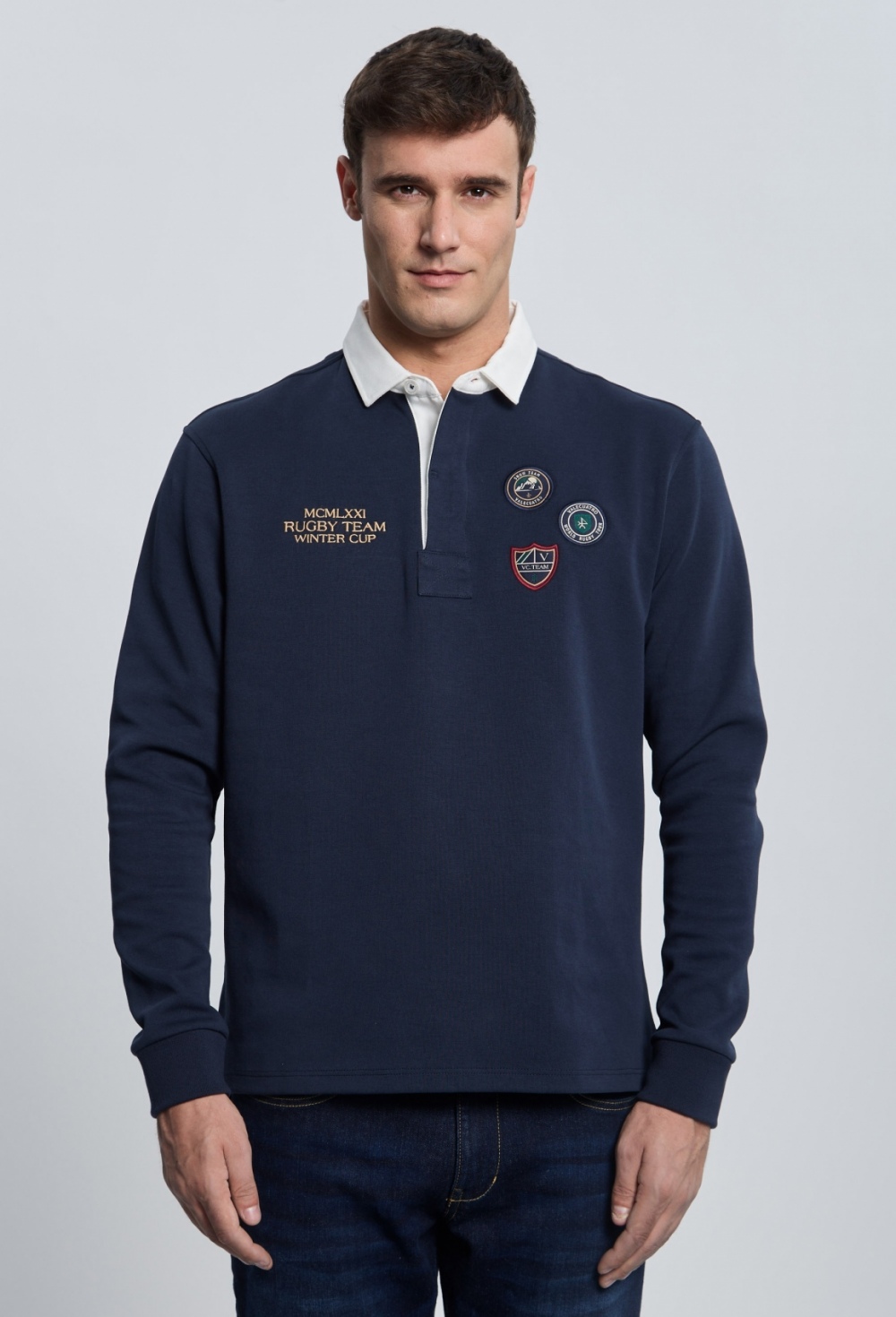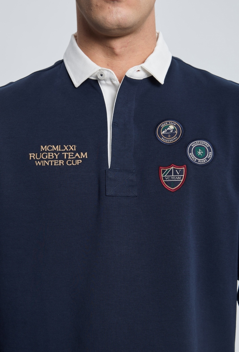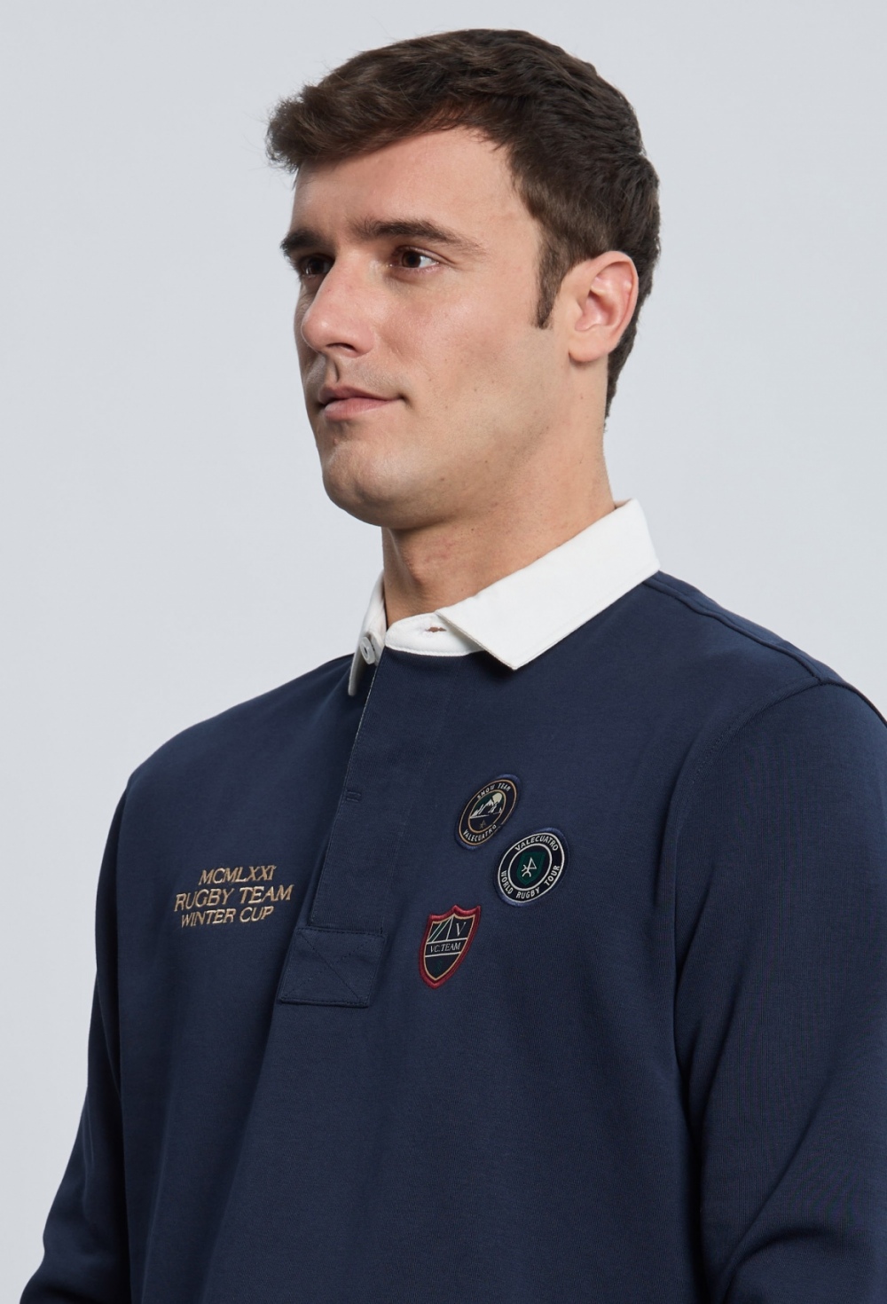 Polo rugby azul marino confeccionado en algodón con cuello de rugby en twill. Cierre mediante tapeta oculta, botones personalizados y manga larga. Bajo con aberturas laterales. Una prenda caracterizada por los bordados.