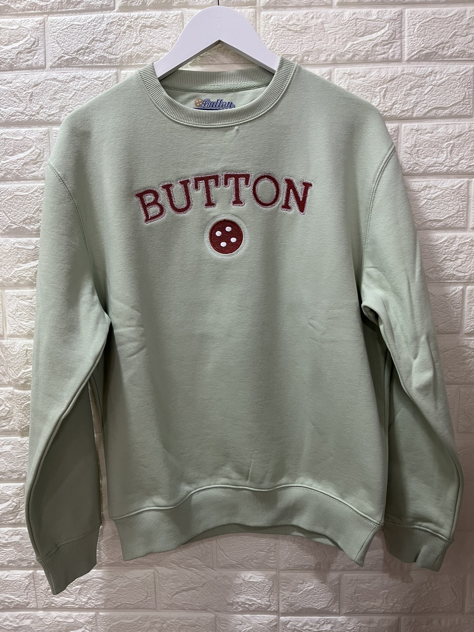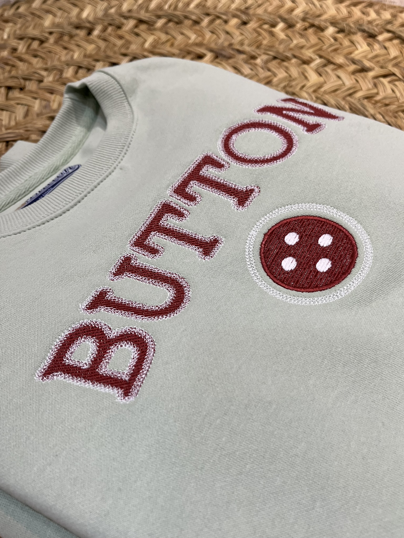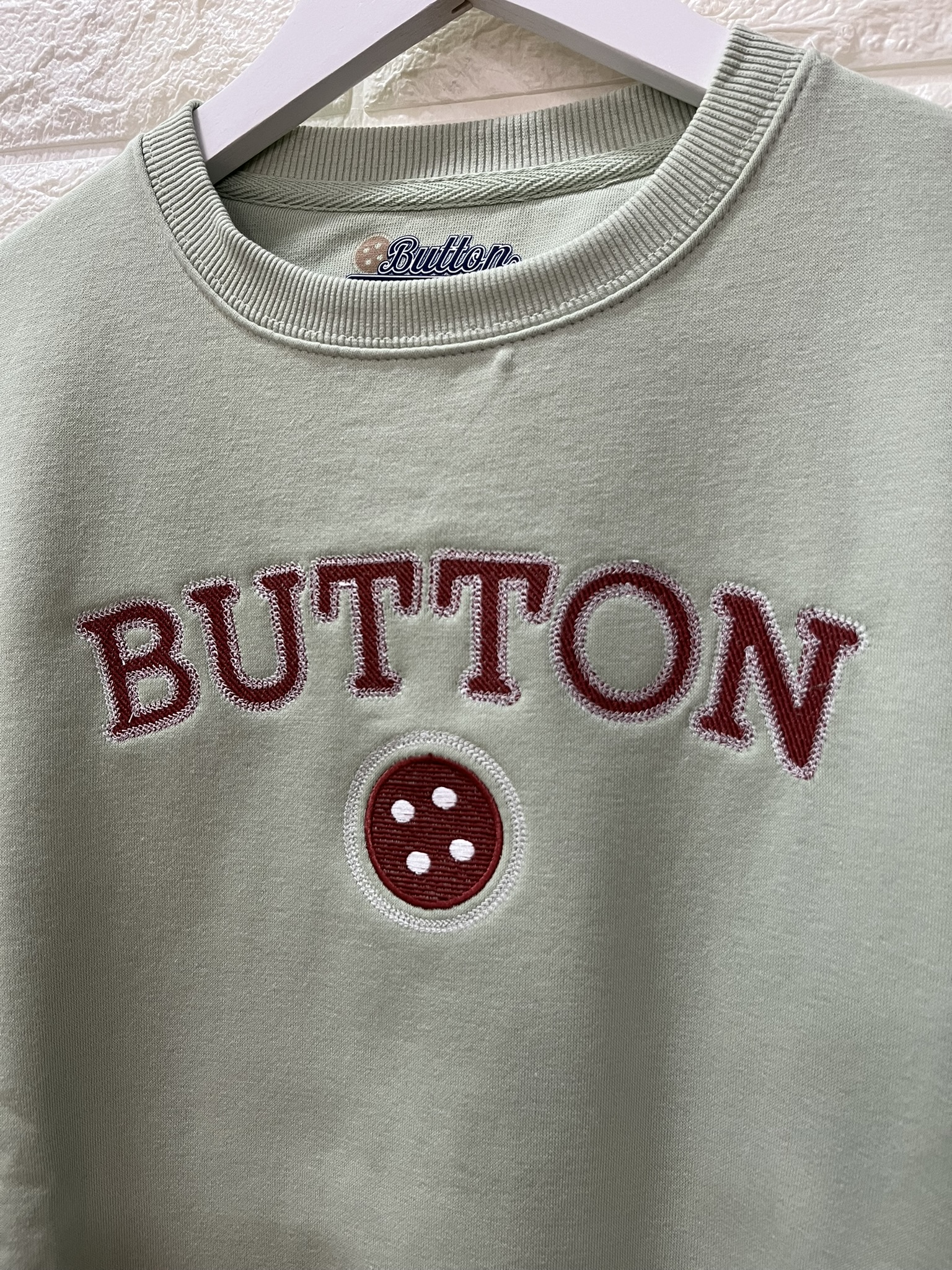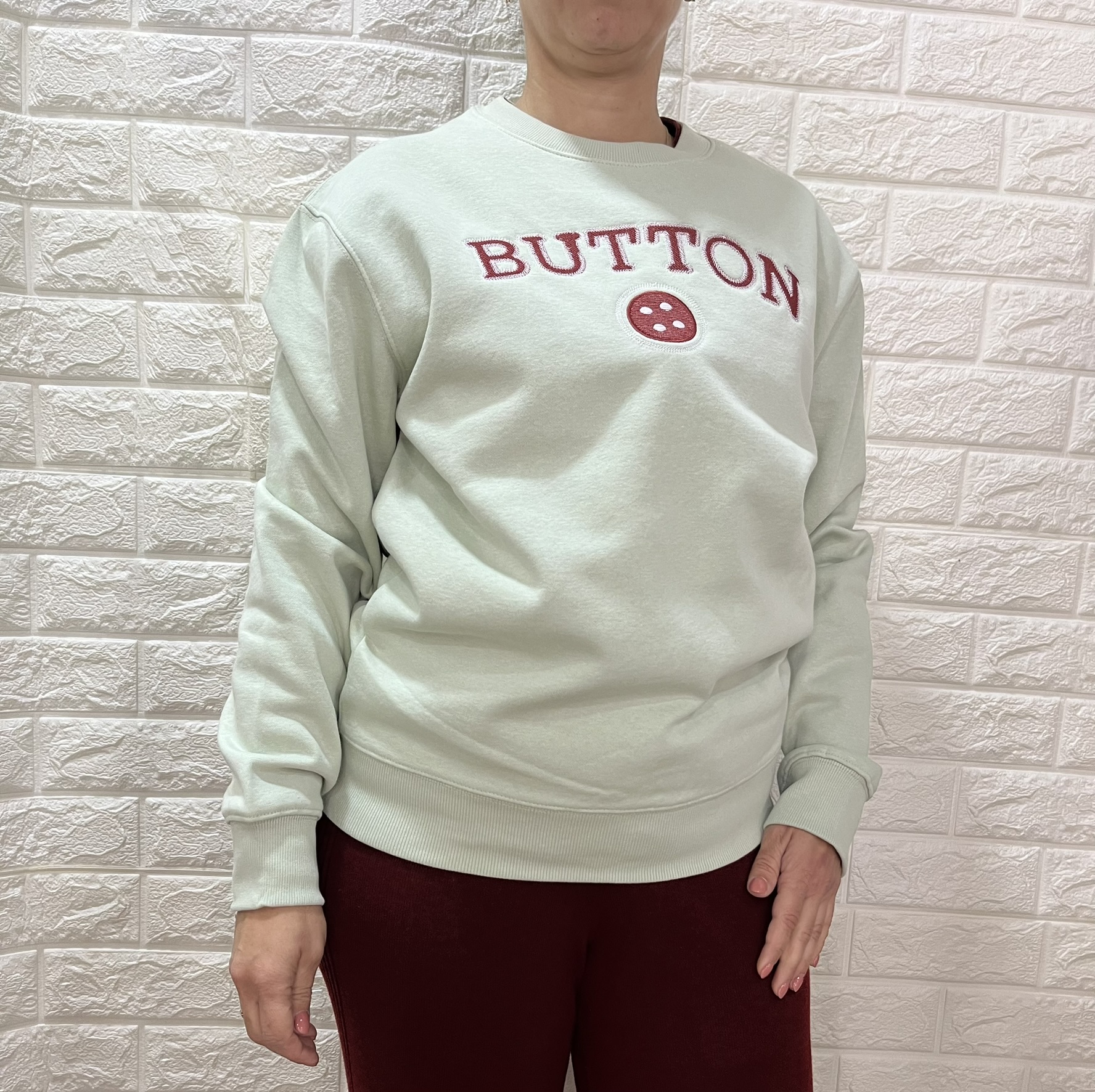 Sudadera para mujer de la marcar URBAN BUTTON, confeccionada en suave algodón color verde menta. Bordado en la parte frontal en tono burdeos. Un ajueste cómodo y relajado.